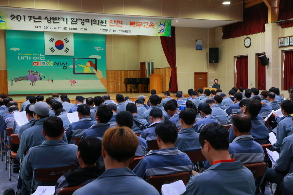 인천 남구는 21일 구청 대회의실에서 환경미화원 140명을 대상으로 복무 및 안전사고 예방교육을 실시했다. 사진은 환경미화원들의 근무시간, 청소작업시 준수사항 등과 관련된 복무교육이 진행 중인 모습.(사진제공=남구청)