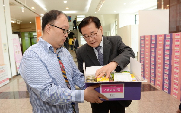 지난 23일 유덕열 서울 동대문구청장이 김형준 동안교회 담임목사로부터 통조림·카레·장류 등 3~5만원 상당의 물품으로 구성된 ‘기쁨나눔상자’ 3400개를 기탁받았다. 사진은 유 구청장(오른쪽)이 기쁨나눔상자의 구성물을 살펴보고 있는 모습.(사진제공=동대문구청)