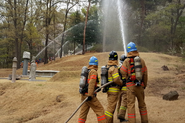 은평소방서는 지난 21일 북한산에서 은평구청, 은평경찰서, 의용소방대 등 6개 기관 합동으로 160여명이 참여한 대대적인 산불진압훈련을 실시했다. 사진은 소방공무원들이 소방호스로 훈련을 진행하는 모습.(사진제공=은평소방서)