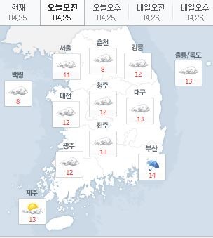 25일 오전 현재 서울은 11도, 대전은 12도, 춘천은 8도, 강릉 12도, 대구 13도, 부산 13도, 부산 14도, 제주 13도를 기록 중이다.