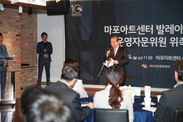 박홍섭 서울 마포구청장이 지난 24일 오전 마포아트센터 스튜디오에서 열린 ‘마포아트센터 발레아카데미 운영자문위원회 위촉식’에 참석해 관계자들과 이날 참석한 내빈들에게 축사를 건네고 있다.(사진제공=마포구청)