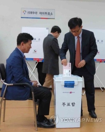 제19대 대통령 재외선거가 25일 해외 각지에서 시작된 가운데 중국 랴오닝성 주 선양 대한민국총영사관 내 설치된 투표소에서 신봉섭 선양 총영사(오른쪽)가 투표하고 있다. 선양 총영사관이 관할하는 동북3성 지역에서는 이번 선거에 2천179명이 유권자로 등록해 작년 총선 때 767명에 비해 2.8배 늘어났다.
