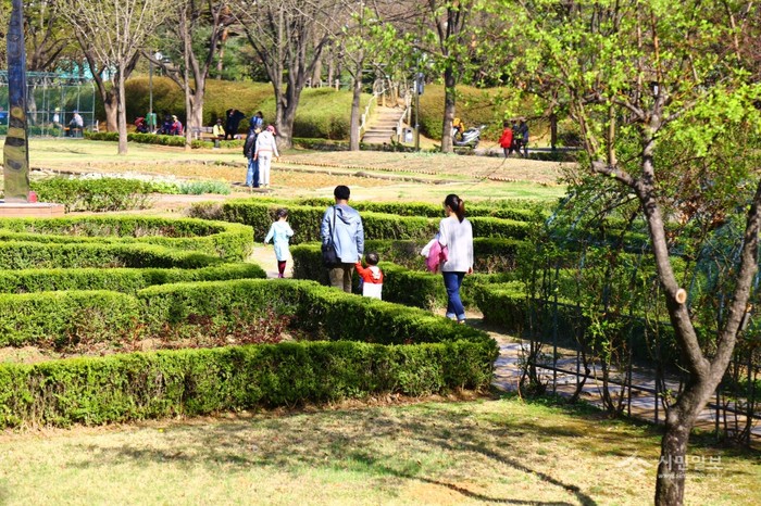 | ▲ 신트리 공원을 방문한 가족들이 나무울타리로 만들어진 미로를 걷고있다. | ||