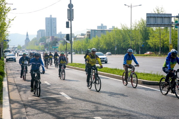 지난 25일 서울 강동구가 고덕동 자전거 종합서비스 센터~강동구청 구간을 자전거로 달리며 녹색생활 실천을 홍보하는 ‘자전거 이용 녹색출근 캠페인’을 개최했다. 사진은 도로를 달리며 홍보하고 있는 참가자들의 모습.(사진제공=강동구청)