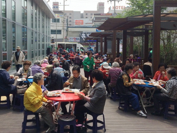 경기 용인시 기흥구 신갈동 행정복지센터는 지난 25일 ‘(사)여럿이 함께 푸드뱅크’와 함께 지역내 저소득 취약계층 노인을 대상으로 무료로 점심식사를 대접하는 ‘사랑의 밥차’ 봉사활동을 실시했다. 사진은 노인들이 식사하는 모습.(사진제공=용인시청)