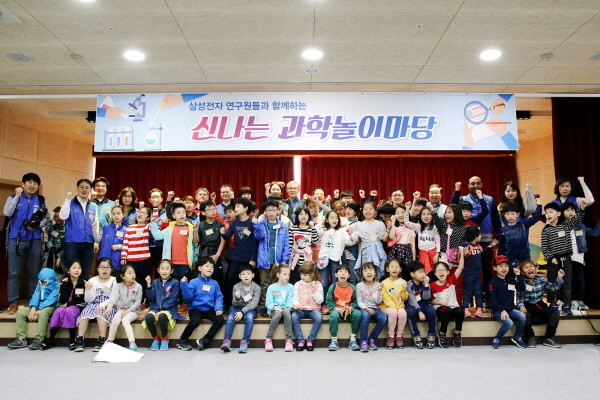 최근 경기 오산시 꿈두레도서관은 삼성전자 종합기술원 봉사단과 함께 지역내 다문화 어린이를 초청해 '신나는 과학놀이마당'을 개최했다. 사진은 과학놀이마당에 참여한 어린이들이 행사 후 기념촬영을 하는 모습.(사진제공=오산시청)