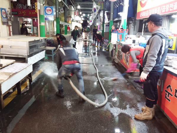 경기 평택시 통복동 소재 통복시장 상인회와 통복동 의용소방대는 지난 26일 쾌적한 전통시장 환경 조성을 위한 대청소 행사를 실시했다. 사진은 통복시장 상인들이 시장 통로를 물청소 하고 있는 모습.(사진제공=평택시청)