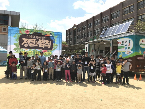 최근 경기 양평군은 양평군저탄소녹색성장위원회와 함께 양평동 초등학교에서 가족과 어린이들이 함께하는 ‘정글의 법칙 에너지 제로캠프’를 개최했다. 사진은 캠프에 참석한 어린이들과 가족들이 기념촬영을 하는 모습.(사진제공=양평군청)