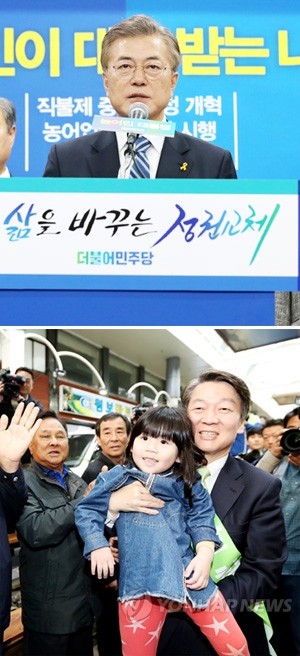 (아래) 국민의당 안철수 대선후보가 27일 오전 제주 서귀포시 매일올레시장을 찾아 한 어린이를 안고 포즈를 취하고 있다.