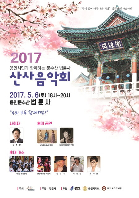 [용인=오왕석 기자](재)용인문화재단(이사장 정찬민)과 용인문수산법륜사 공동주최로 ‘법륜사 산사음악회’를 5월6일 오후 6시 문수산 법륜사에서 진행한다. 재단은 법륜사와 함께 매년 산사음악회를 마련해, 용인시민에게 봄꽃향이 그윽한 산사에서 아름다운 문화를 함께 즐길 수 있는 무대를 선보이고 있다.