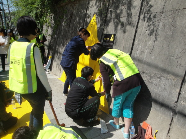 지난 27일 아이들의 안전한 등하굣길을 위해 서울 동대문구 휘봉초등학교 학부모, 교사 등 15~20여명이 국제아동인권센터 스태프의 지도에 따라 학교 주변 통학로 횡단보도에 옐로카펫 설치를 하고 있다.(사진제공=동대문구청)