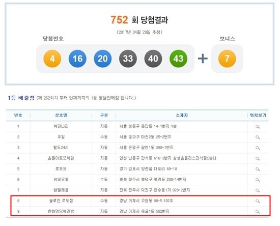 확인결과 1등 당첨자 배출 판매점 소재지는 서울 성동구 용답동, 서울 송파구 마천2동, 서울 은평구 갈현1동, 인천 남동구 간석동, 경기 김포시 양촌읍, 충북 청주시 흥덕구 봉명동, 전북 전주시 덕진구 인후동1가, 경남 거제시 고현동, 경남 거제시 옥포1동 등 9곳으로 거제시에서 2명이나 1등 당첨자를 배출 한 것.