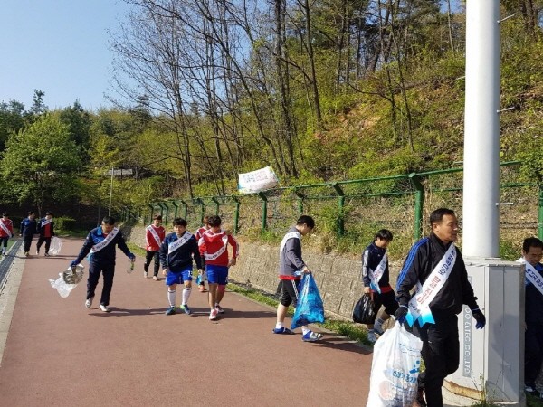 경기 안산시 선부2동 체육회가 최근 체육회·조기축구회원 30여명과 함께 국토대청결운동 및 환경 캠페인을 실시했다. 사진은 석수골운동장에서 운동을 마친 후 집으로 돌아가며 버려진 쓰레기를 수거하고 있는 회원들의 모습.(사진제공=안산시청)