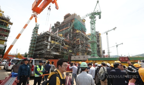 | ▲ 근로자의 날에 삼성중공업 경남 거제조선소에서 타워크레인 사고로 대형 인명피해가 발생, 2일 현장 관계자와 취재진이 사고 현장을 둘러보고 있다.(사진제공=연합뉴스) | ||