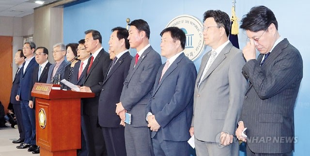바른정당 홍문표 의원(가운데) 등 비유승민계 의원 13명이 2일 오전 국회 정론관에서 집단 탈당, 자유한국당(옛 새누리당)으로의 복당과 한국당 홍준표 후보 지지를 선언하고 있다. 당초 14명이 이날 탈당하려고 했으나 정운천 의원은 3일 후에 지구당에서 탈당을 선언하기로 했다고 홍문표 의원이 전했다. 왼쪽부터 홍일표, 김학용, 박성중, 여상규, 박순자, 이군현, 홍문표, 김재경, 김성태, 황영철, 이진복, 권성동, 장제원.