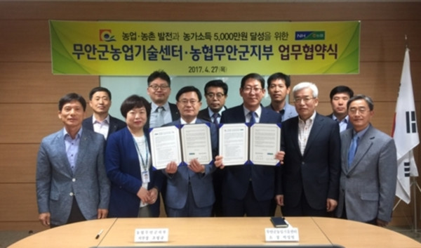 최근 전남 무안군농업기술센터와 농협무안군지부는 농협무안군지부에서 농업인의 소득향상과 지역농업 발전을 위한 상호협력·교류에 관한 업무협약을 체결했다. 사진은 협약식 후 관계자들이 기념촬영을 하는 모습.(사진제공=무안군청)