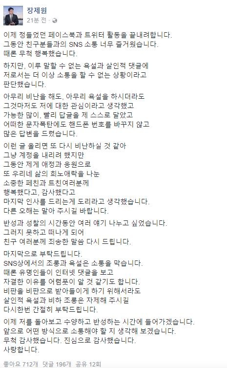 이에 장제원 의원은 끝내 해당 댓글들을 견디지 못하고 SNS 계정을 폐쇄한 것으로 보이며 마지막으로 남긴 글 또한 이를 지적하고 있다.