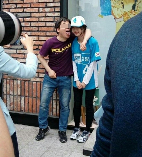 사진 속 한 남성은 유담 씨의 목에 팔을 감고 얼굴을 향해 혀를 내밀고 있다. 유담 씨는 손을 모으고 있지만 몸을 움츠리며 당황한 기색이 역력하다.
