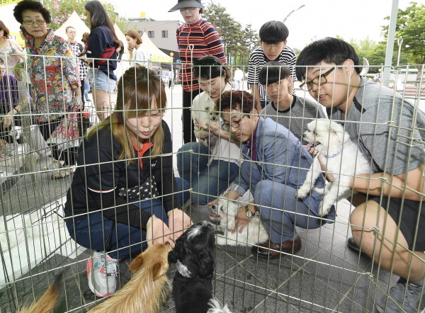 지난 4일 광진구가 지하철 7호선 어린이대공원역 인근 광진광장에서 ‘유기동물과의 만남의 날’ 행사를 개최했다. 사진은 행사에 참여한 시민들이 유기동물을 안아보고 있는 모습.(사진제공=광진구청)