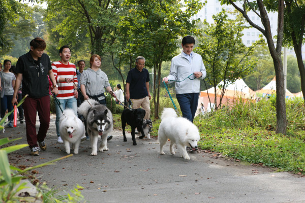 | ▲ 반려동물 사랑축제에 참여한 이해식 구청장(오른쪽)과 방문객들이 반려견과 함께 산책을 즐기고 있는 모습.(사진제공=강동구청) | ||