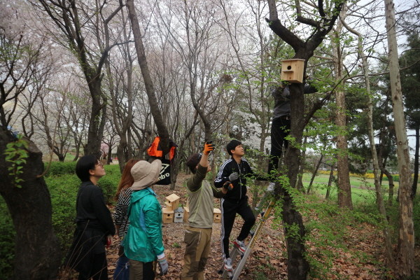 인천 연수구목공봉사동아리 아트트리는 최근 재능 기부의 일환으로 연수둘레길 제5구간(연수동주차장~동막역)에 새장을 설치했다. 사진은 관계자들이 나무 위에 설치한 새장을 바라보는 모습.(사진제공=연수구청)