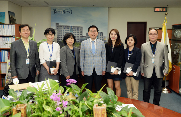서울 동대문구가 8일 ‘제45회 어버이날’을 기념해 7명의 공무원을 효행공무원으로 선정했다. 사진은 효행공무원으로 선정된 직원들이 유덕열 구청장(가운데)과 함께 기념촬영을 하고 있는 모습.(사진제공=동대문구청)
