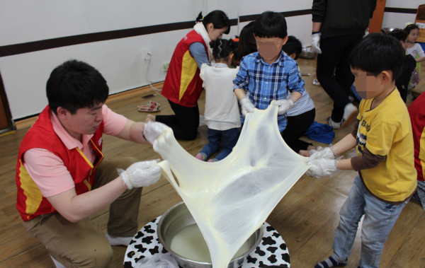 최근 서울지방우정청 행복나눔 봉사단이 가정의 달을 맞아 성로원 아이들을 대상으로 파주치즈스쿨을 방문해 체험행사를 실시했다. 사진은 체험장에서 치즈를 잡아당겨 늘려보고 있는 아이들의 모습.(사진제공=서울지방우정청)