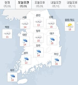 9일 현재 서울은 14도, 춘천 13도, 대전 14도, 대구 15도, 부산 16도, 제주 14도를 기록 중이다.