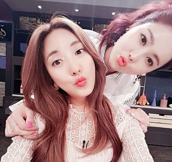 게재된 사진 속 솔비는 바다의 어깨를 감싸며 입술을 쭉 내밀고 있으며 바다 역시 똑같은 표정을 짓고 있다.