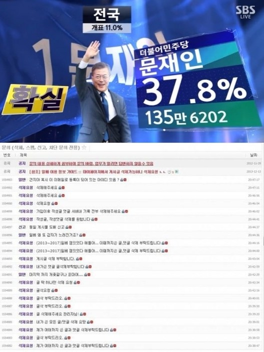더불어민주당 문재인 후보가 대통령으로 당선된 가운데 보수 성향의 온라인 커뮤니티 ‘일간베스트저장소(이하 일베)’에 ‘게시물 삭제 요청’ 게시물이 쏟아지고 있다.