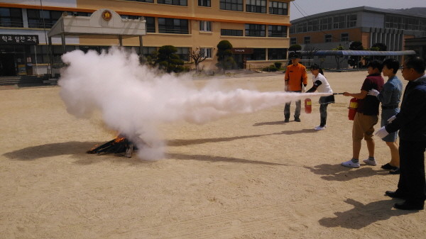 경기 하남소방서는 지난 8일 오전 고골초등학교 전교생 및 교직원을 대상으로 '공공기관 합동소방훈련'을 실시했다. 사진은 학생들이 소화기 사용 실습을 하는 모습.(사진제공=하남소방서)