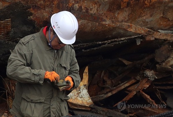 | ▲ 세월호 선내수색 중 사람의 것으로 추정되는 뼈가 발견된 10일 오전 세월호가 거치된 전남 목포신항만에서 박선주 충북대 명예교수가 무언가를 살펴보고 있다.(사진제공=연합뉴스) | ||