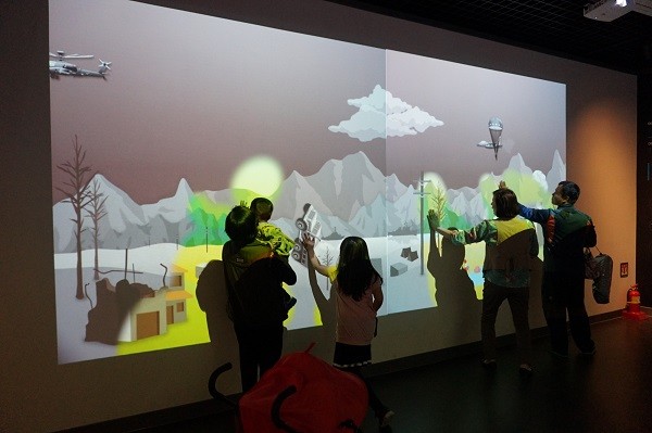 사진은 벽면을 터치하는 순간, 전쟁의 무기들이 꽃으로 승화되는 ‘디지털 미디어 체험관’의 모습. ‘고양평화통일 교육전시관’은 꽃박람회 기간 후에도 계속 운영되며 관람료는 무료다.