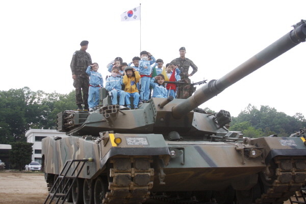 지난 10일 육군 제5기갑여단은 지역민 175명(어른 75명, 어린이 100명)과 함께하는 ‘한마음 축제’를 개최했다. 사진은 축제에 참석한 어린이들이 기갑차 위에서 경례를 하는 모습.(사진제공=제5기갑여단 정훈공보부)