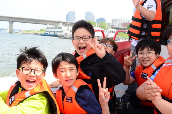 서울 영등포소방서는 지난 10일 서울 영림초등학교 학생들과 지도교사, 영등포구청 청소년지도협의 연합회원을 대상으로 ‘청소년과 함께하는 119안전체험 투어’를 실시했다. 사진은 수난구조대가 하는 일에 대해 알아보기 위해 구조정에 승선한 학생들이 포즈를 취하는 모습.(사진제공=영등포소방서)