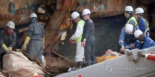 | ▲ 세월호 선내수색 중 사람의 것으로 추정되는 뼛조각 1점이 추가 발견된 11일 오후 세월호가 거치된 전남 목포신항만에서 현장수습 관계자들이 뼛조각이 발견된 선미 좌현 쪽에서 작업을 하고 있다.(사진제공=연합뉴스) | ||