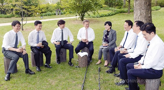 문재인 대통령이 11일 청와대에서 열린 신임수석과 오찬에서 참석자들과 대화하고 있다. 왼쪽부터 시계방향으로 권혁기 춘추관장, 이정도 총무비서관, 조국 민정수석, 문 대통령, 조현옥 인사수석, 임종석 비서실장, 윤영찬 홍보수석, 송인배 전 더불어민주당 일정총괄 팀장.