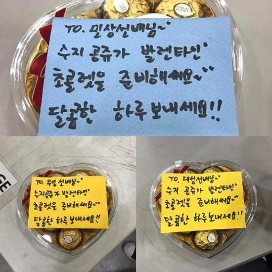 공개된 사진에는 "선배님~ 수지 공쥬가 발렌타인 초콜렛을 준비해써요~ 달콤한 하루 보내세요!"라는 메모와 함께 이수지가 선물한 초콜릿이 담겨있다. 특히 유민상에게 선물한 초콜릿 메모지만 색깔이 달라 시선을 끈다.