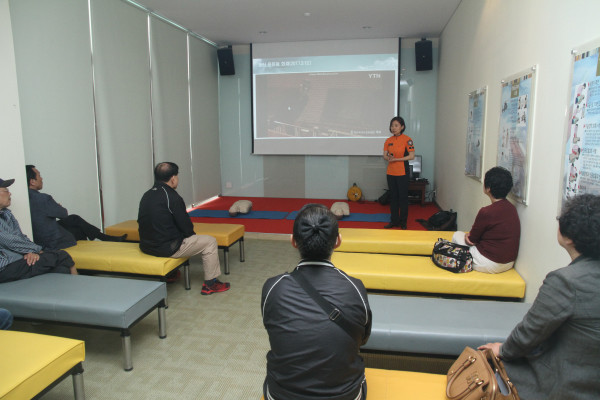 서울 은평소방서는 최근 시민안전체험관에서 다중이용업소 영업주와 종업원들을 대상으로 소방안전교육을 실시했다. 사진은 소방관이 응급처치요령에 대해 설명하는 모습.(사진제공=은평소방서)