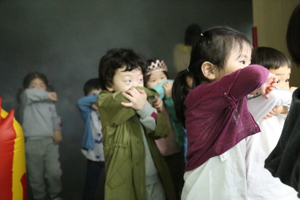 강남소방서는 지난 11일 오전 소방서를 방문한 압구정원HB 놀이학교 어린이를 대상으로 소방안전교육을 실시했다. 사진은 어린이들이 연기대피훈련을 하는 모습.(사진제공=강남소방서)