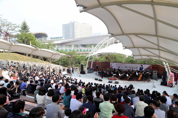 경기 용인시가 지난 11일 시청광장 노인복지관 옆에 조성된 ‘태교음악당’에서 시민 600여명이 참석한 가운데 개관기념 음악회를 개최했다. 사진은 태교음악당 개관식에서 오케스트라의 축하 연주가 진행되고 있는 모습.(사진제공=용인시청)