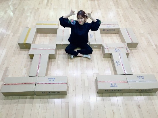 사진 속 모모는 상자를 이용해 자신의 이름을 만들어 두 손을 머리위에 올려 귀엽고 깜찍한 표정을 짓고 있다.
