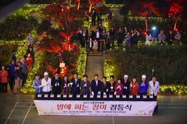 지난 12일 나진구 중랑구청장(가운데)이 묵동천 장미정원에서 오는 19일부터 열리는 2017 서울장미축제를 밝힐 ‘밤에 피는 장미 점등식’에 참석해 서울장미축제의 서막을 알렸다. 사진은 나 구청장, 서영교 국회의원, 강대호 의장 등이 점등식을 진행하는 모습.(사진제공=중랑구청)