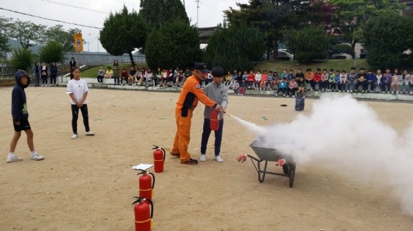 경기 이천소방서는 최근 표교초등학교에서 교직원과 전교생을 대상으로 합동소방훈련을 실시했다. 사진은 학생들이 소방관의 지도를 받아 소화기로 화재진압 체험을 하는 모습.(사진제공=이천소방서)