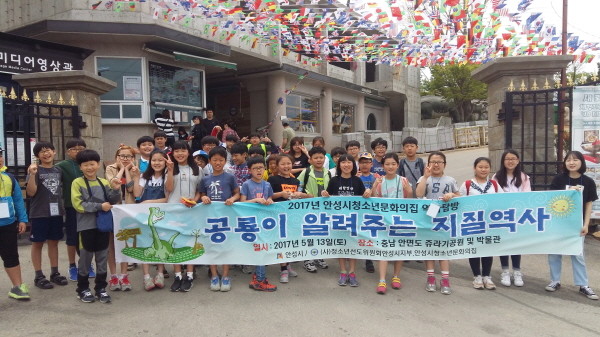 경기 안성시가 주최하고 청소년문화의집이 주관하는 ‘공룡이 알려주는 지질역사 체험활동’이 지난 13일 충남 태안군 안면도 쥬라기 박물관에서 진행됐다. 사진은 이날 행사에 참여한 지역내 초등학생들이 기념촬영을 하는 모습.(사진제공=안성시청)