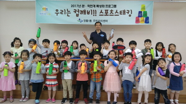 경기 수원시 영통구 영통1동은 지난 12일 미세먼지와 황사로 밖에서 뛰어놀기 어려운 아이들을 위해 작은 실내공간에서도 쉽게 즐길 수 있는 건강스포츠 '스포츠스태킹'을 개강했다. 사진은 어린이들이 스피드스택스 컵을 들고 기념촬영을 하는 모습.(사진제공=영통구청)