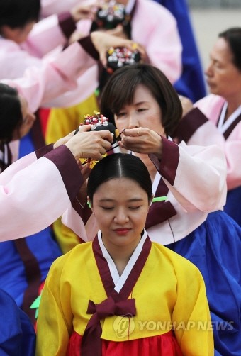 성년의 날인 15일 오전 서울 중구 남산골 한옥마을에서 열린 제45회 전통 성년례 재현행사에서 참석자들이 족두리를 착용하는 가례를 치르고 있다.