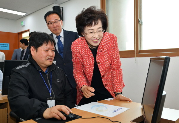 지난 15일 박춘희 서울 송파구청장이 정보화 소외계층을 위해 삼성SDS의 후원으로 송파자활지원센터에서 열린 ‘송파자활 드림스쿨’에 참석해 교육생들에게 격려의 말을 전했다. 사진은 박 구청장이 한 교육생과 함께 수업을 진행하고 있는 모습.(사진제공=송파구청)