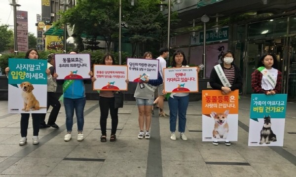 지난 13일 서울 강동구가 동물보호 시민운동단체 ‘케어’, 강동고 자원봉사단체 ‘샤프론’, (사)한국동물구조관리협회 등의 회원들과 함께 천호동 로데오거리 나비쇼핑몰 앞과 현대백화점 천호점 지하 입구에서 ‘동물사랑&생명존중 문화공연 거리캠페인’을 펼쳤다.(사진제공=강동구청)