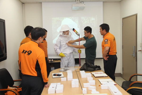 서울 관악소방서는 지난 15일 오전 서울대학교 농업생명과학대학에서 119구조대원들을 대상으로 벌집제거 현장대응 구조훈련을 실시했다. 사진은 소방대원들이 벌집제거 관련 장비 조작훈련을 진행하는 모습.(사진제공=관악소방서)
